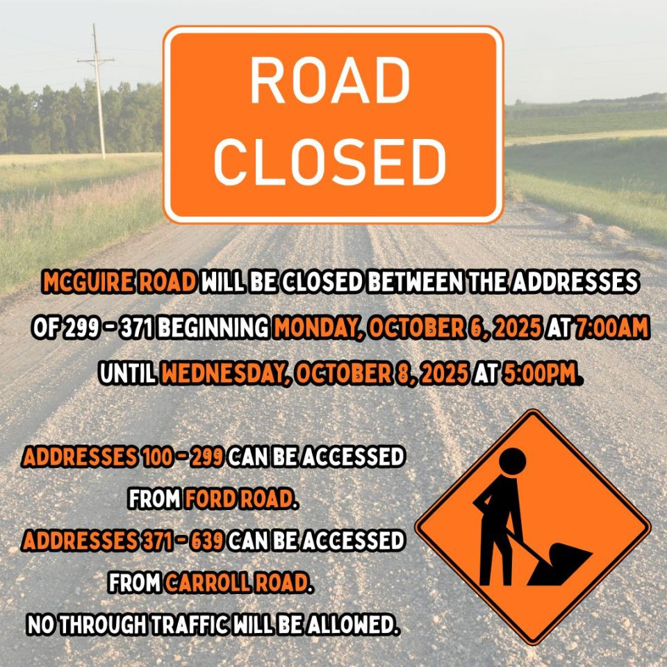 McGuire Road will be closed between civic numbers 299 and 371 on Monday October 6 at 7:00am until Wednesday October 8 at 5:00pm for realignment and widening! The project will be taking place all week, but the full closure is only expected Monday-Wednesday.